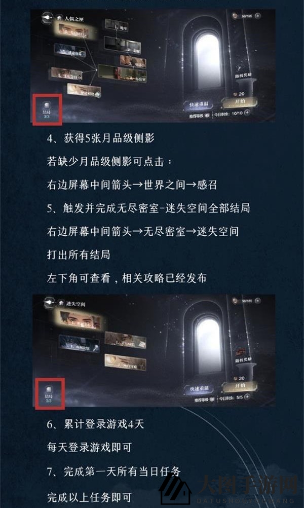 5、解锁并完成无尽密室-迷失空间所有结局:点击屏幕中央箭头→无尽密室→迷失空间,解锁所有结局。