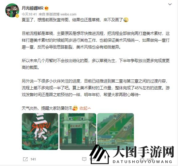 在进度上,作者透露,游戏已进入第二章与第三章的过渡阶段,流程上已完成近一半,整体进度约为45%。