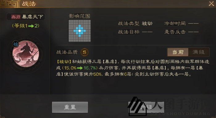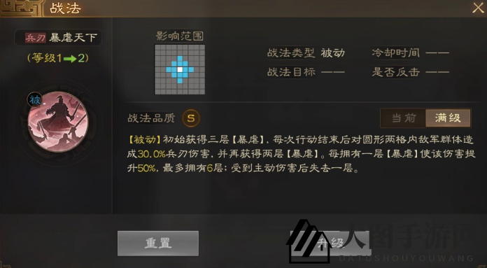 [被动]初始获得三层[暴虐],每次行动结束后对圆形两格内敌军群体造成30%兵刃伤害,并再获得两层[暴虐]。每拥有一层[暴虐]使该伤害提升50%,最多拥有6层;受到主动伤害后失去一层。