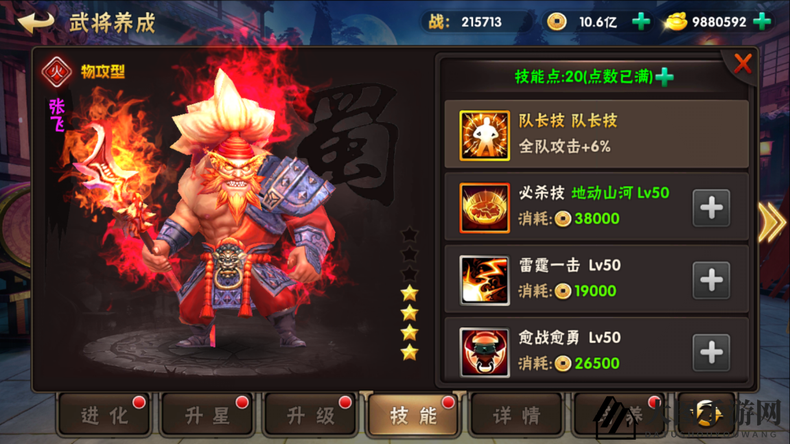 技能升级需消耗金币和技能点,每级需1点技能点,上限为武将等级。技能点每10分钟恢复10点,上限20点。购买福利礼包后,技能点上限可达999点,加速技能升级。