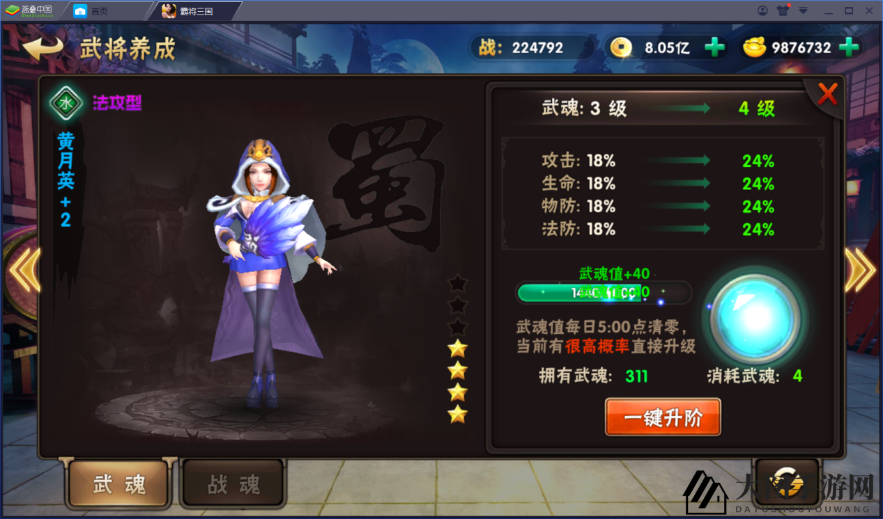 提升武将武魂值,增加等级提升几率。武魂值越高,等级提升概率越大。武魂等级提升时,基础属性百分比上涨,显著提升战斗力。武魂主要通过太虚幻境玩法获得。