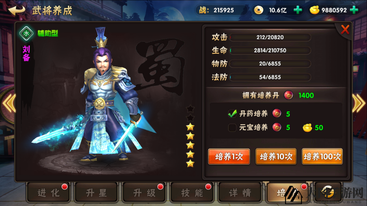 使用培养丹在武将养成界面,可随机提升或降低属性,固定有益结果提升战斗力。培养丹可通过斗技场积分奖励获得,或参与押镖活动。