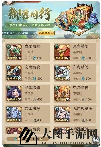 活动期间,玩家们通过参与日常活动,即可有机会获得【御兽令】与【珍贵御兽令】,兑换九天、四海、八荒、十狱系的奇珍异兽,还能兑换传说中的四圣兽,让你的御兽军团更上一层楼。