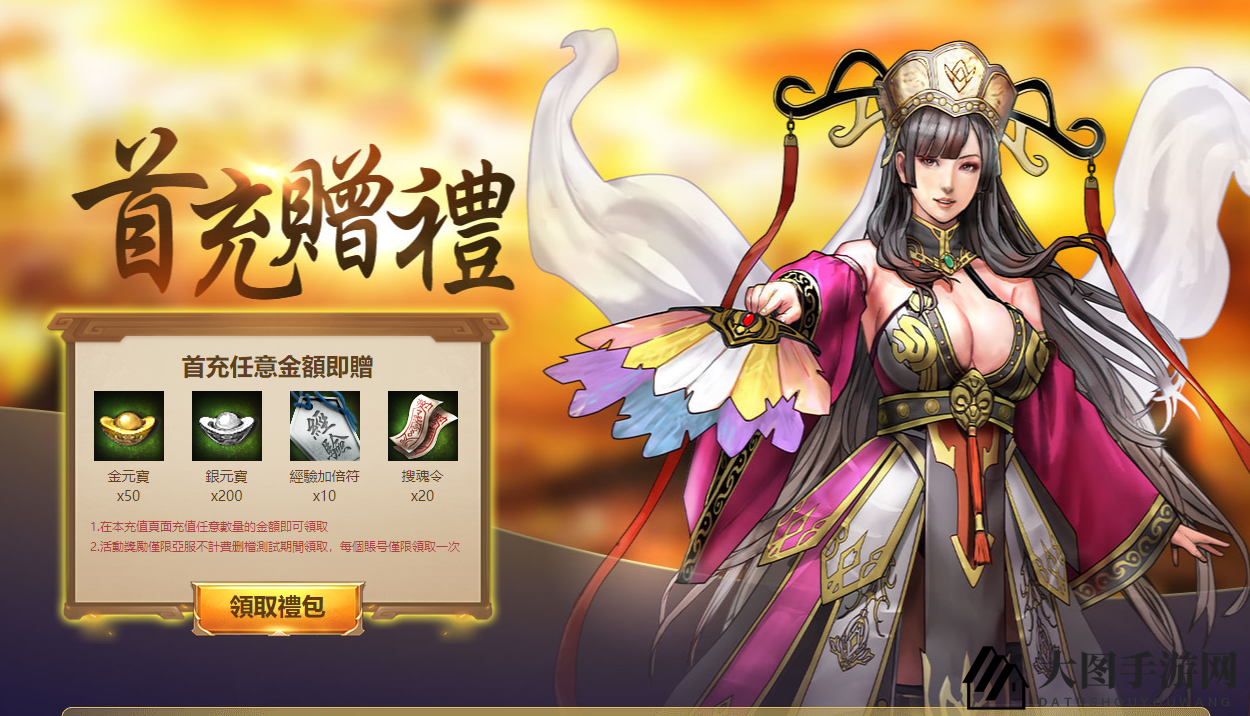 网页充值支持更多支付方式,更便捷。首充任意金额,即可在活动页面领元宝首充礼包,包括金、银元宝,经验加倍符,搜魂令等道具奖励!
