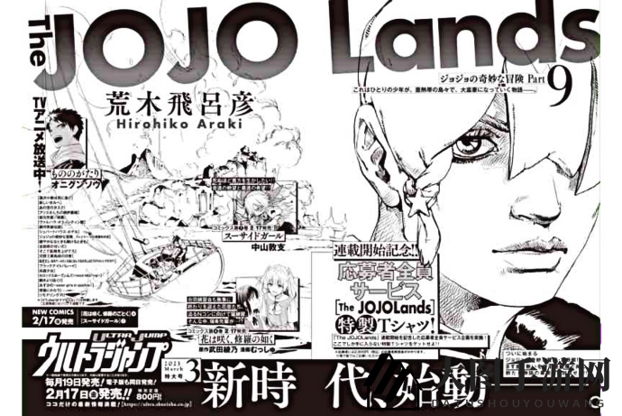 在第9部作品《JOJOLANDS》中,一位少年将在充满亚热带风情的岛屿上踏上成为巨富的传奇之旅,这部漫画将于2月17日开始在《Ultra Jump》3月号连载。