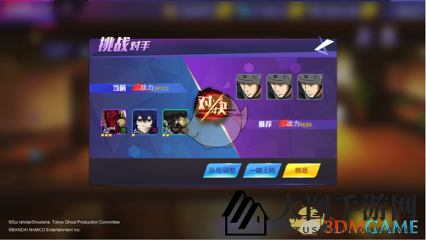 点击画面中的敌人,可查看对决信息。玩家可在此进行队伍调整、一键上阵(自动选择实力最强的角色)以及开始挑战。