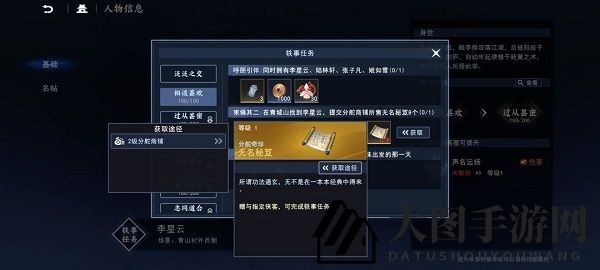 1.在《不良人3》中,每位英雄的传奇任务各具魅力。以李星云为例,完成她的任务需要集结李星云、陆林轩、张子凡和姬如雪四位英雄,若缺少姬如雪,便是天意安排。但另一任务仅需8个无名秘籍,我们可查阅获取途径来获得。