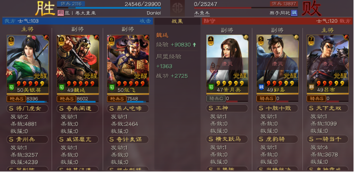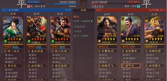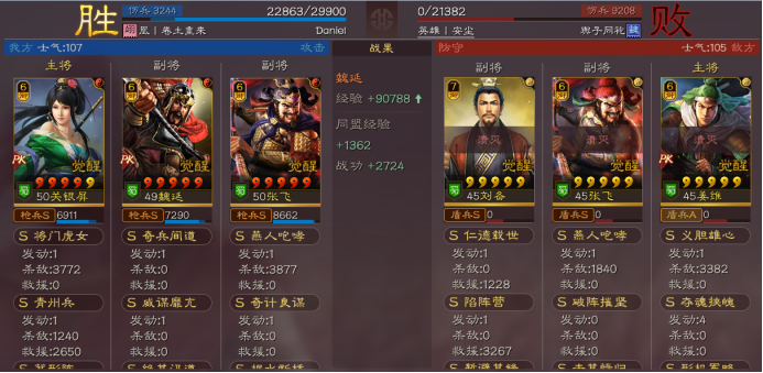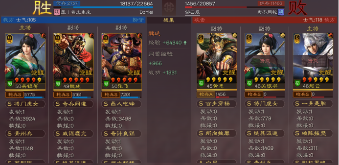 其他方面就不再赘述,控制方面:关妹虎嗔与魏延威谋的强强联手,输出方面:张飞的稳定输出和青州兵的配合,队伍共有6个输出战法,在这个续航和控制体系中,足以展示其风采。