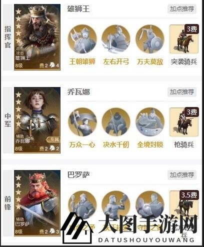 此阵容为追求高输出的追击流派,雄狮王和乔瓦娜都是追击伤害的顶尖选择,巴罗萨的加入让阵容的前锋更加坚实,为这两大输出核心提供强大后盾。在此阵容中,巴罗萨应选用输出型技能,以发挥其最强战斗力。