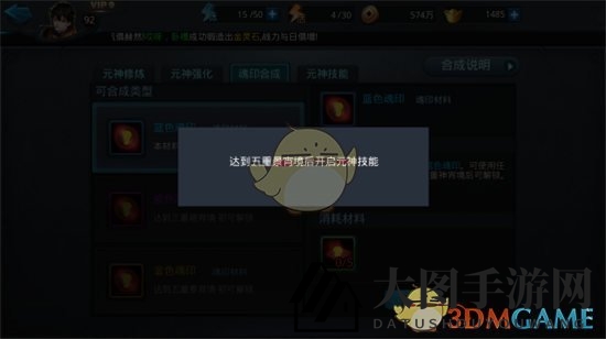 蓝魂晶可强化0-4级元神,晶砾可用于强化失败后的元神,集齐一定数目晶砾可100%强化成功。三、魂印合成奥秘魂印合成类似装备合成系统,绿色合成蓝色,蓝色合成紫色,紫色合成金色。合成随元神开启逐步开放。