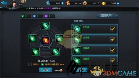 绿色合成蓝色成功率55%,合成失败返还绿魂印和绿魂息。