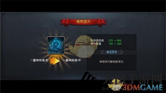 升级后属性增强,解锁神霄窍孔,可用魂印填充。魂印分为绿、蓝、紫、金四个等级,属性多样,玩家可根据阵型搭配。