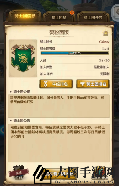 固定任务助力团级提升,完成可获得金币和骑士团货币,任务挑战度高,需团队协作。