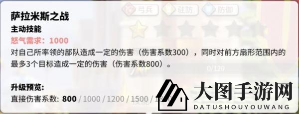 技能1,萨拉米斯之战:自身部队300伤害,前方扇形3目标1800伤害,无递减。