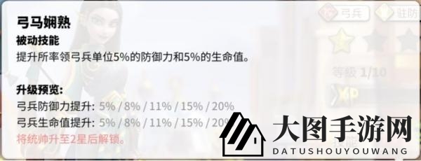 技能2,弓马娴熟:提升弓兵20%防御和生命值。