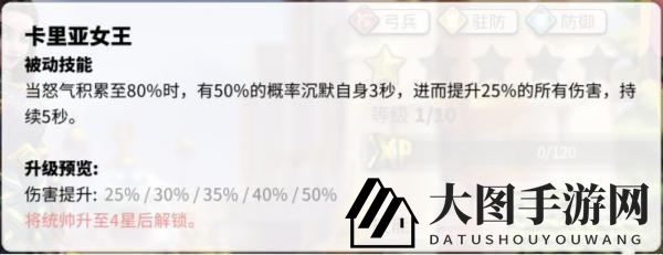 技能4,卡里亚女王:怒气80%时,50%概率沉默3秒,增伤50%持续5秒。