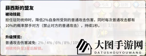 技能3,薛西斯的盟友:驻防时减伤10%,每次普通攻击10%概率禁手1秒。