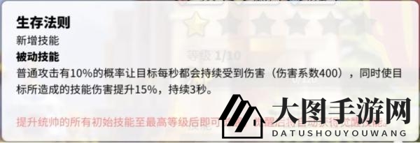 觉醒,生存法则:普通攻击10%概率1200伤害,但对方技能伤害+15%,持续3秒。