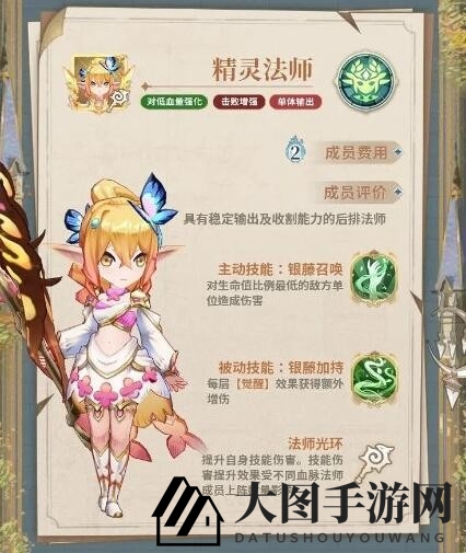 精灵法师的主动技能【银藤召唤】能对生命值最低的敌人造成攻击力一定比例的伤害。在41级和121级时,每次击杀敌人,技能倍率都会提升(可叠加),并对低血量单位造成额外伤害。