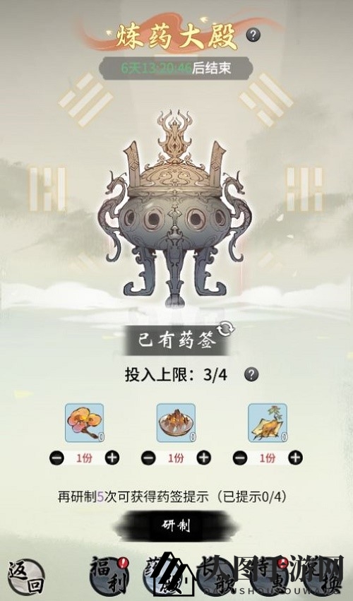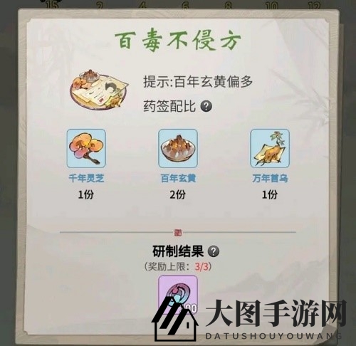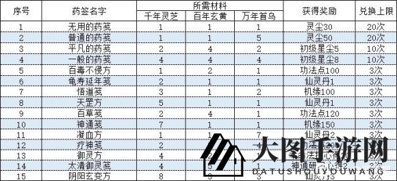 无用药签配方:千年灵芝1、百年玄黄1、万年首乌5、奖励灵尘30、兑换上限20次