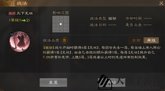 [被动]开战即获4层[无双],每回合消减一层。每有敌军阵亡,加一层[无双],若由自己击杀,则额外加一层。每层提升自身7%伤害和免伤,最高5层。达3层或以上,免疫所有控制效果。