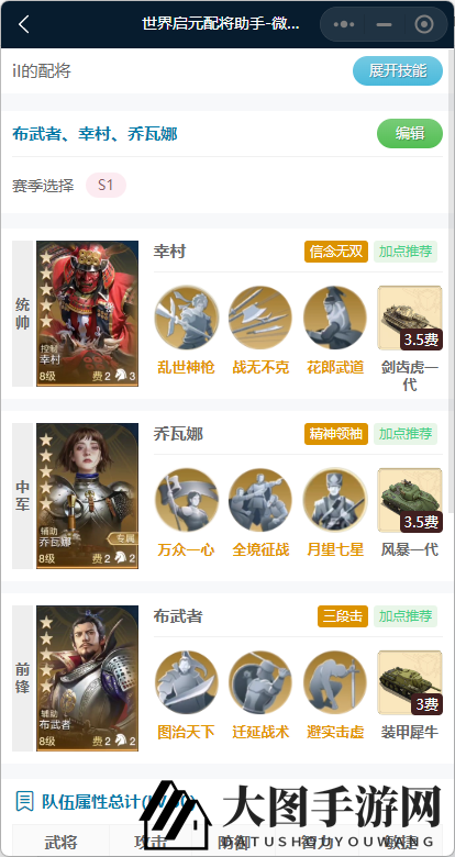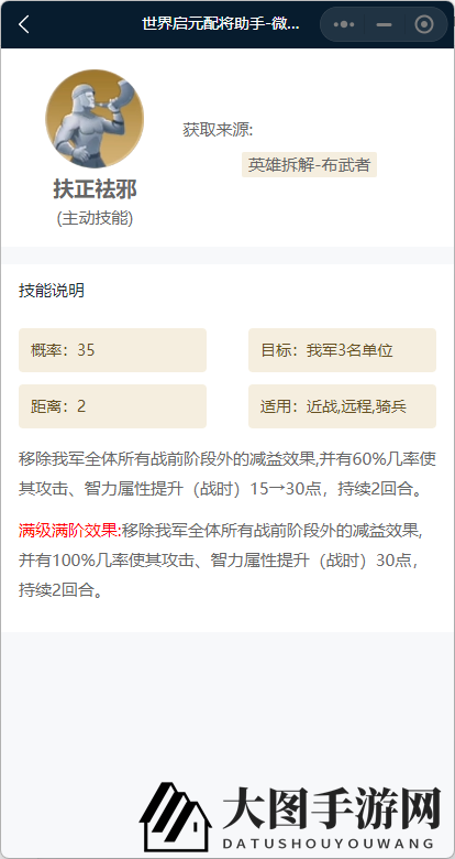 “扶正祛邪”不仅能为全队提供净化效果,还能100%提升攻击和智力,效果显著;发动率为35%,立即发动,表现稳定。与枭雄曹老板的解控技能相配合,能确保队友输出不受干扰,只要运气不是太差。不过曹老板并非本文焦点,此处略过。让我们聚焦布武者,其自带技能“图治天下”虽少被开发,实则效果非凡。