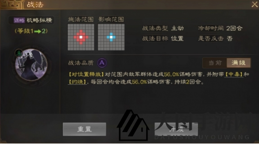 [对位置释放]对范围内敌军群体造成56.0%谋略伤害,并附带[中毒]和[灼烧]。每回合均会遭成56.0%谋略伤害,持续2回合。