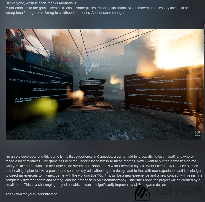 人气爆棚的跑酷大作《Only UP》今天在Steam平台发布了官方公告,游戏制作者Indiesolodev公开表示,这款游戏即将从Steam下架。他透露,自《Only UP》开发以来,承受了巨大的心理压力,亟需一段宁静的时光来恢复心情。休整过后,他计划创作一款全新游戏《Kith》(暂定名)。