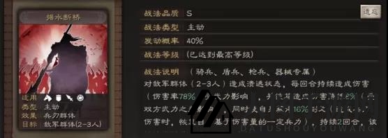 据水断桥:功能性全面,集减伤、恢复、输出于一体,属于万能战法。但伤害偏低,受制于减伤战法和草船的普及,锯水伤害难以超过4000。若仅从输出能力考虑,可替代据水的战法很多。