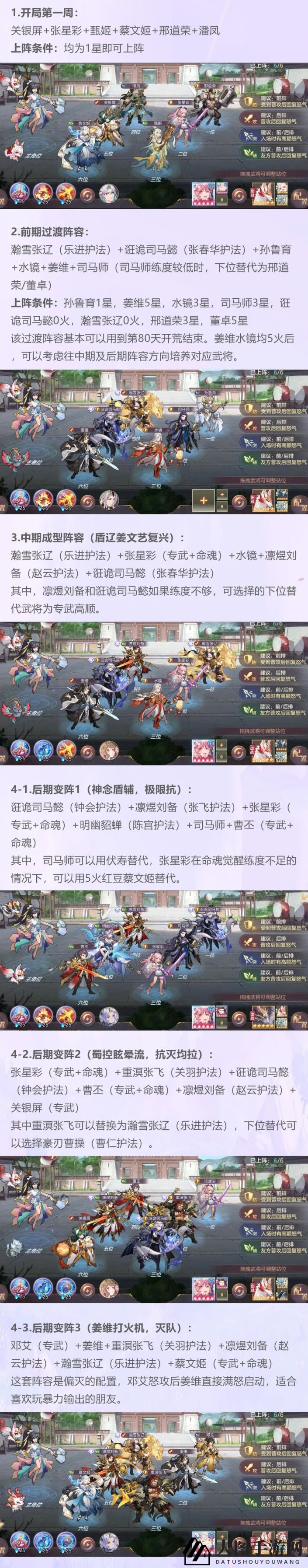 此过渡阵容适用至第80天开荒结束。姜维水镜均5火后,可考虑培养中期及后期阵容。