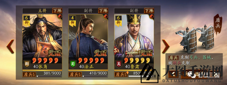 法正贴上黄巾标签,可提升太平10%的自带主动战法发动率,鲁肃在“草船借箭”锦囊的增益下,盾兵适性提升至S,形成“锋矢天公盾”。