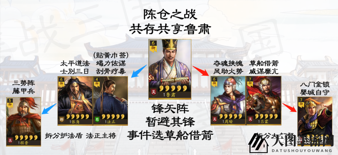 共享鲁肃阵容以锋矢阵和弓兵为核心,通过巧妙调整武将标签的锦囊,极大地提升了配队的灵活性。在“鉴往知来”锦囊中,鲁肃的“草船借箭”事件还能获得额外加成,有效节省一个盾兵宝物。