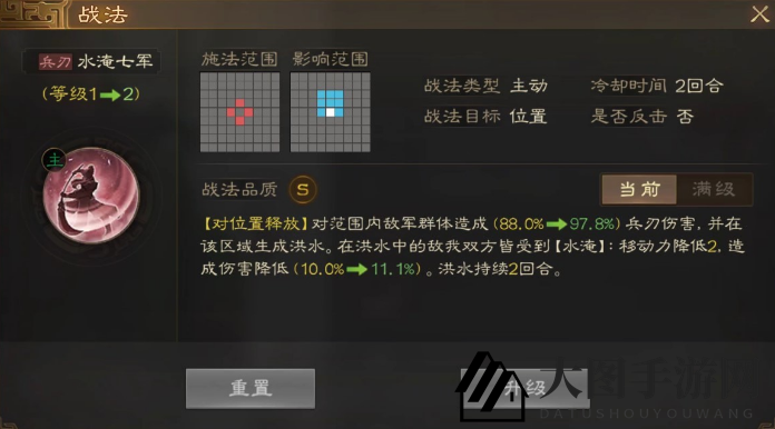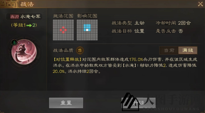 [水淹效果]移动力降低2,造成伤害降低(20%),洪水持续2回合。