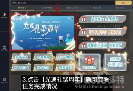 3. 点击【光遇礼聚周年】,即可查看任务完成情况。(无论官服还是渠道服,皆可参与活动)