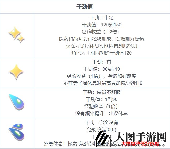 需警惕的是,当干劲值降至“完全没有”时,进行出击或探索将严重降低角色好感度!