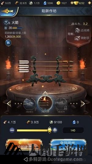 陷阱作坊提供三大类陷阱:落石、火箭和滚木,它们各自针对不同的敌人。随着陷阱作坊等级的提升,你能解锁更高级的陷阱,这些陷阱在战斗中更具威力。比如,落石陷阱能有效克制步兵如盾兵和枪兵;火箭陷阱对付骑兵如近战骑和骑射手;滚木陷阱则针对弓兵和弩兵。因此,合理搭配陷阱,针对不同敌人制定策略至关重要。