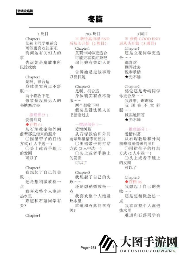 以下是详细攻略,建议您按照顺序阅读,每个条目对应一周目的攻略。TE结局藏在第四周目,解锁后,全新剧情将逐一展开。