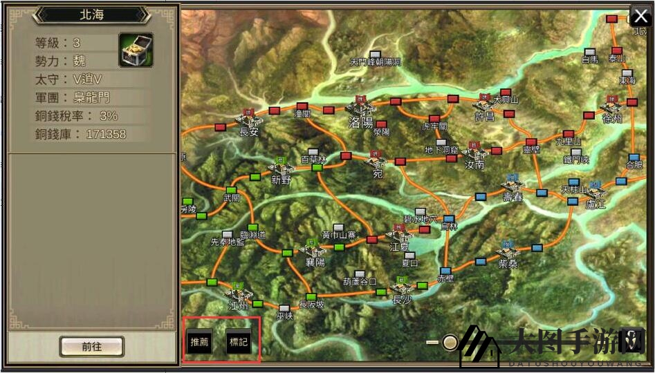 在大地图中,通过“推荐钮”寻找修炼圣地,或点击“标记”设置回城。