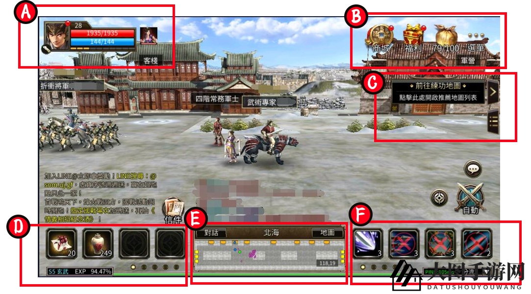 E:便捷小地图,点击“地图”切换至大地图,点击“对话”开启聊天。