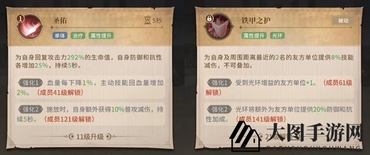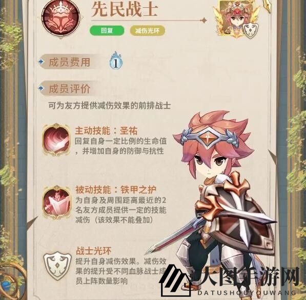 被动技能【铁甲之护】,能让先民战士为自己与最多2名队友提供技能减伤,随着等级的提升,光环效果可覆盖至3名队友,并额外增加防御和抗性。