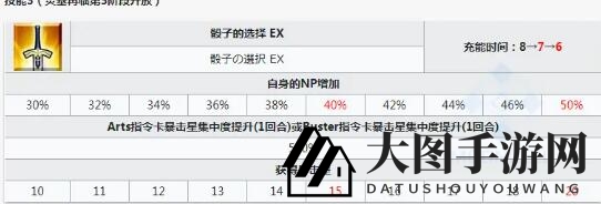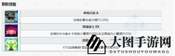 10暴伤,5蓝放,5宝具威力提升,自身魅惑·混乱·恐怖·技能封印无效。前两个技能比较普通,后面的弱体无效相当实用,不仅免疫了三个异常控制类技能,还免疫了技能封印,可以说是相当实用的被动技能。