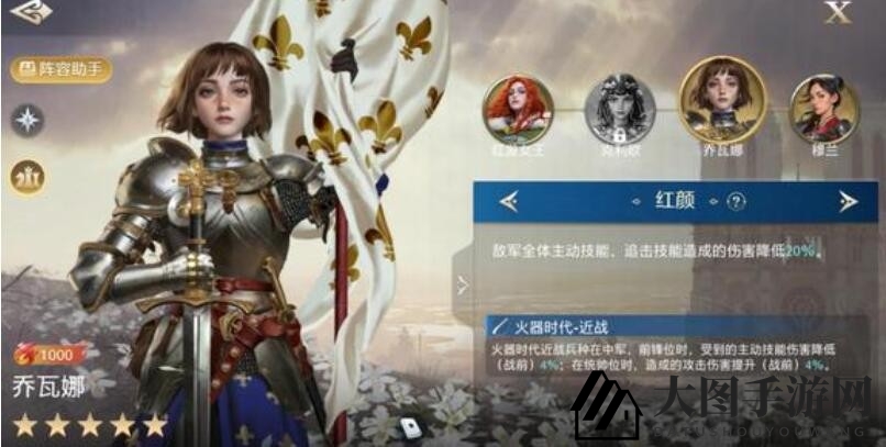 2、乔瓦娜还能与穆兰、红发女王、克利欧组成命运羁绊“红颜”,使敌方全体主动技能、追击技能造成的伤害降低20%。