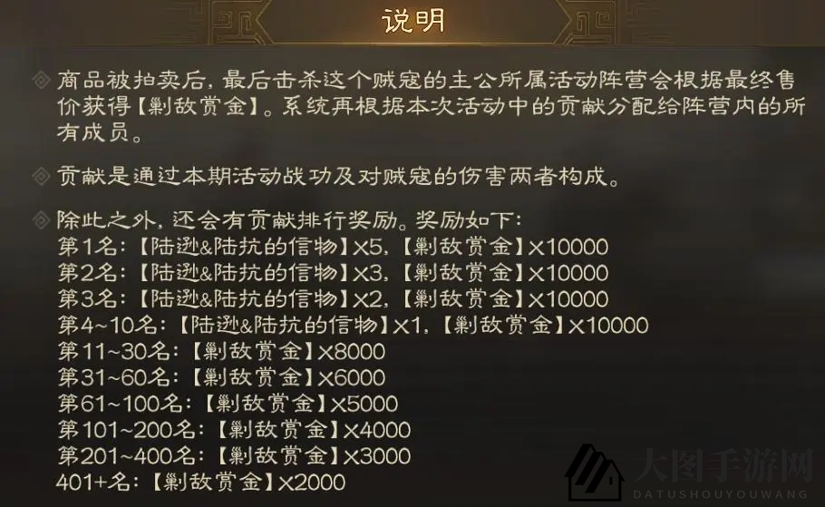 3、活动结束后,将根据活动战功和贼寇伤害进行排名,前400名的奖励相当丰厚,而401名之后的奖励则是剿敌赏金X2000。