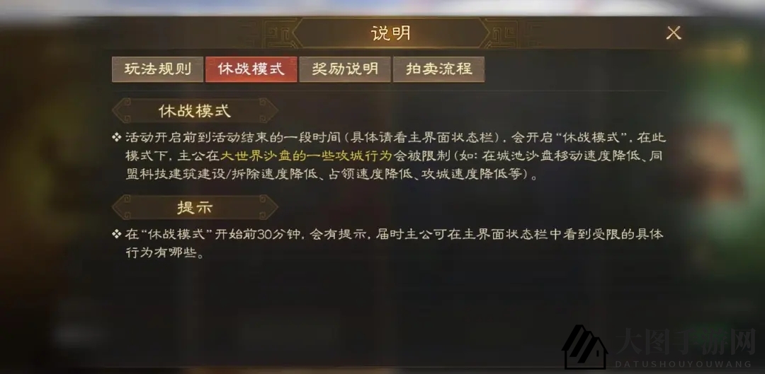 4、此外,还有一个不可忽视的休战时段。通常在周六下午三点左右开始,持续至晚上九点左右结束。这个休战时段的DEBUFF效果等同于夜战模式,战功等只有十分之一,此时应保留兵力,确保活动开始时你的两个预约部队不在战斗中且处于满状态。