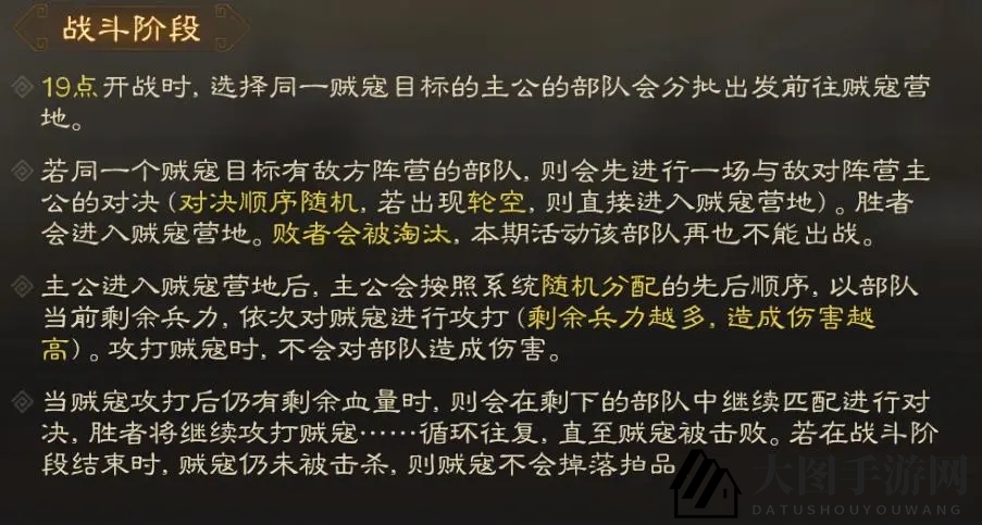 最后一击击败贼寇主公的所属活动阵营可获得拍卖分红,但前提是你必须先战胜对面的主公。在攻打贼寇时,剩余兵力越多,造成的伤害越高。因此,优先派出你最强大的两个部队参战是明智的选择。
