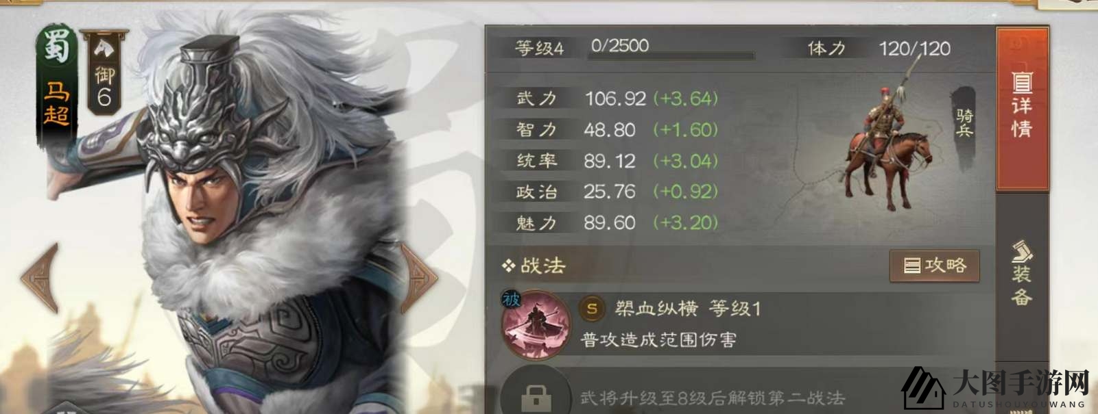 1、马超,这位统帅级骑兵武将,擅长冲锋,武力提升迅速,但生存力稍逊一筹。他的战法【槊血纵横】能对敌人造成广泛伤害;