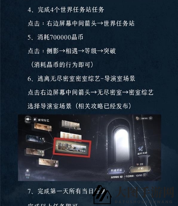 若等级不足,点击:右边屏幕中间箭头→无尽密室,查看优先度顺序。