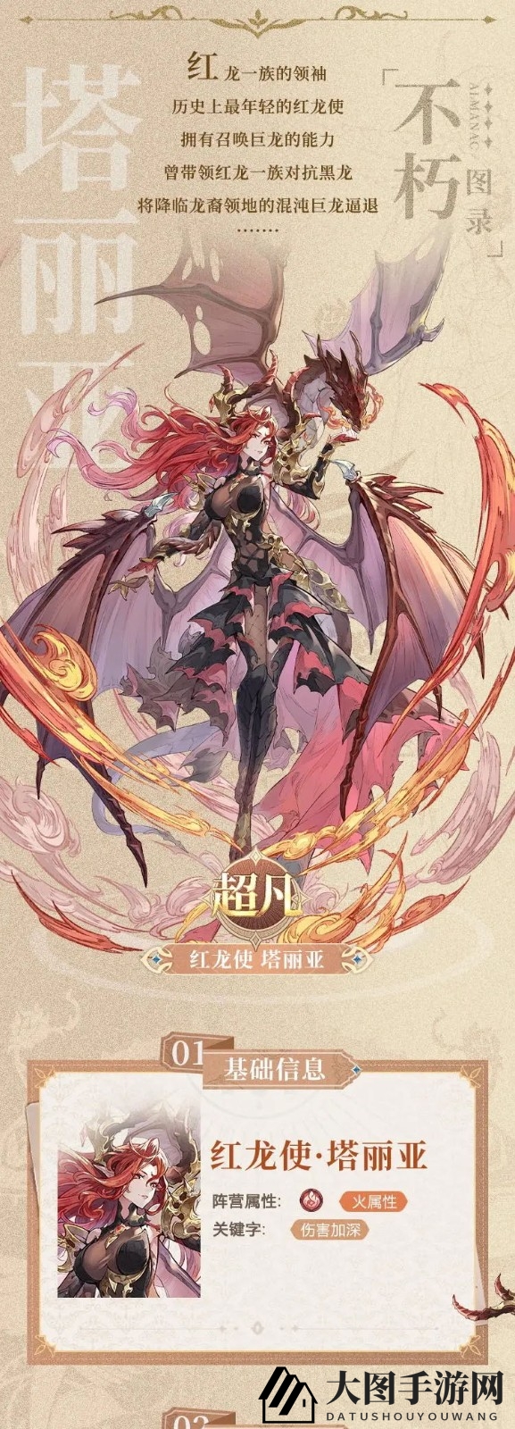 尊敬的探险者们,今天,我将揭示《不朽家族》里的神秘红龙女王——塔丽亚的神秘面纱!她是红龙族群的杰出代表,不仅是最年轻的红龙使者,更是一位能够驾驭巨龙神力的无畏战士。在历史的长河中,她曾率领红龙族群英勇抵抗黑龙的入侵,成功击退了妄图侵占龙裔家园的混沌巨龙,她的名字,已经成为了传说。