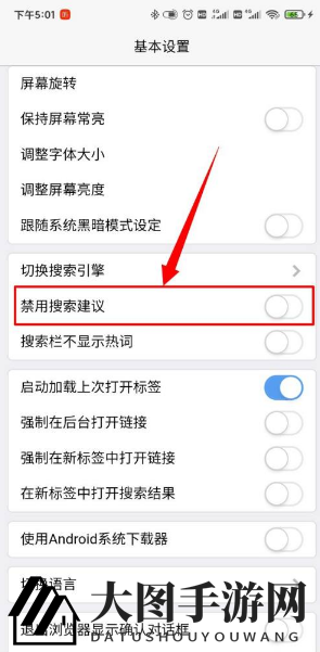 第四步,在“基本设置”中找到并关闭“禁用搜索建议”选项,具体操作请参考上图。