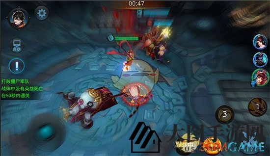 本关挑战在于确保英雄在50秒内不被击败,这对玩家的操作和策略有很高的要求。合理运用AOE技能,既保护英雄安全,又高效击败敌人。
